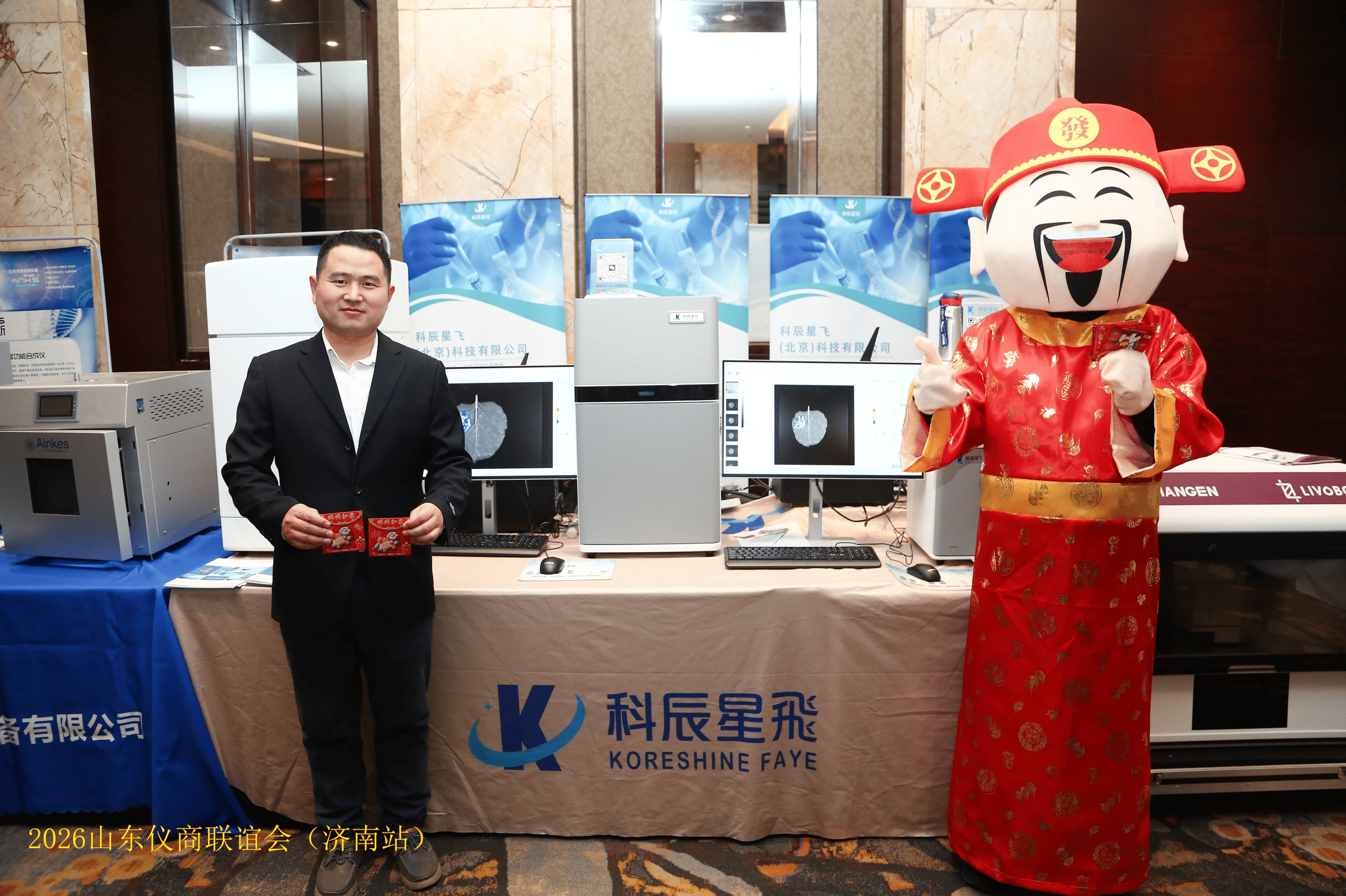 活动现场,“财神”人偶的互动更是为即将来临的农历新年增添了喜庆氛围,寓意着科辰星飞与合作伙伴在新的一年里财源广进、科研成果丰硕。此次联谊会的圆满落幕是2026年的美好开端,科辰星飞将继续深耕齐鲁沃土,为生命科学研究提供更优质的**活体成像解决方案**。